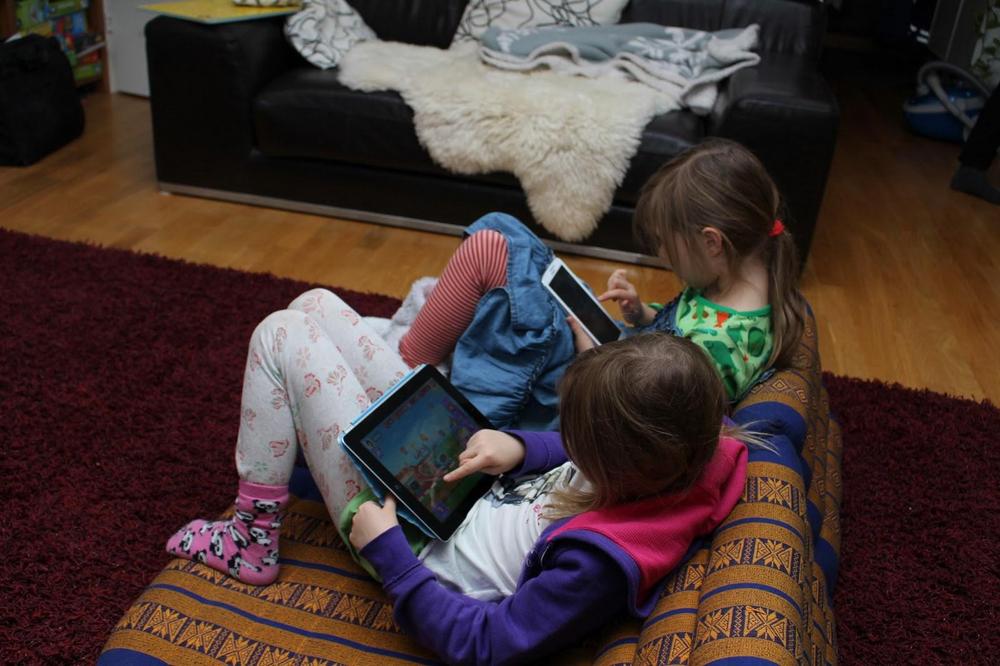 Lapsiperheen seitsemän- ja yhdeksän vuotiaat tytöt olivat valmistautuneet tutkijan ja kuvaajan tuloon ottamalla pelipaikkansa ja tablettinsa esiin keskelle olohuoneen lattiaa. Vanhemmalla siskoksella oli myös kännykkä kädenulottuvilla. Hän kertoi soittavansa sillä lähinnä äidille. Ja hän tietysti vastaa myös äidin soittoihin. Puhelin on kätevä kommunikaatioväline. Pelaamiseen tytöt pitivät kännykkää sopimattomana. Pelikäytössä heillä onkin iPad ja Samsung -tablettitietokone. He esittelivät pelejä, koska tutkimusaikana iltapäivällä oli sopivaa aikaa pelaamisen läksyjenteon ja harrastuksiin lähtemisen välillä. Perheen tableteilla myös soitetaan joka ilta Skype-puheluja ulkomailla töissä olevalle isälle. Joskus Skypeä käytetään myös kännykällä.