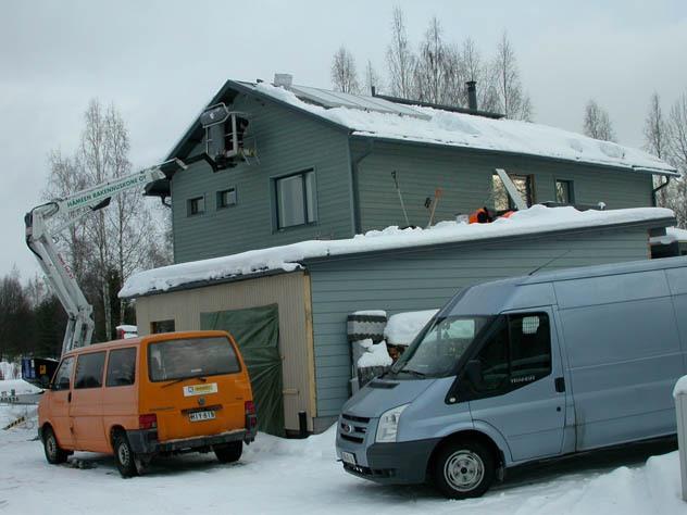 Jannella oli työmaalla hommat siinä vaiheessa, että hän pääsi kohoamaan nostimella kohti talon harjaa. Oli tarkoitus kiinnittää putket edellisenä päivänä katolle asennettuihin aurinkolämpökerääjiin. Myöhemmin näissä putkissa tulisi kulkemaan vesiglykoliseosta, joka taas lämmittäisi talon käyttövettä. Näin auringon valo ja lämpö saadaan hyötykäyttöön.